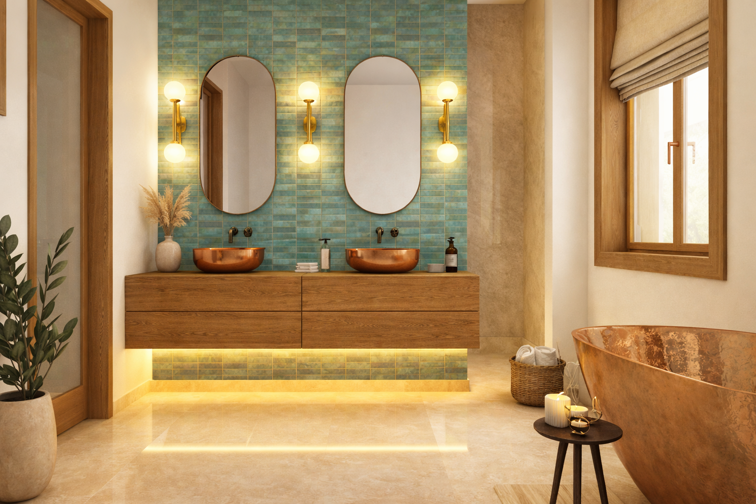 A természetes anyagok meghatározó szerepet kapnak a koncepcióban: a meleg tónusú fa, a strukturált kőfelületek és a réz mosdótálak időtálló karaktert adnak a térnek. A zöld kerámia burkolat és a gunmetal szerelvények elegáns, modern hangsúlyt teremtenek.